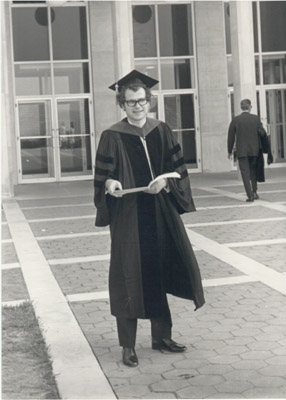 Michael Böhler an der State University of New York, wo er von 1968 bis 1974 eine Assistenzprofessur innehatte, am sogenannten "Commencement Day", der Jahresschlussfeier mit den Promotionen, im traditionellen akademischen Ornat